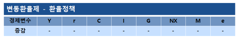 우선 우리나라가 채택하고 있는 변동환율제를 바탕으로 한 소규모 개방경제의 정책효과를 살펴보겠습니다. 변동환율제에서는 정책에 따른 외국시장과 자국시장의 불균형을 환율 조정을 통해 해결합니다.
