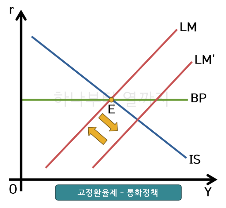 통화정책을 통해 화폐공급량을 늘릴 경우, LM곡선이 단기간에 우측으로 이동합니다. 아울러 통화공급 증가에 따라 원화 공급이 늘어나기 때문에 환율이 상승압력이 발생합니다. 이를 해소하기 위해 통화당국은 다시 통화량을 원래 수준으로 되돌리게 되고, LM은 원래 상태로 되돌아오게 됩니다.