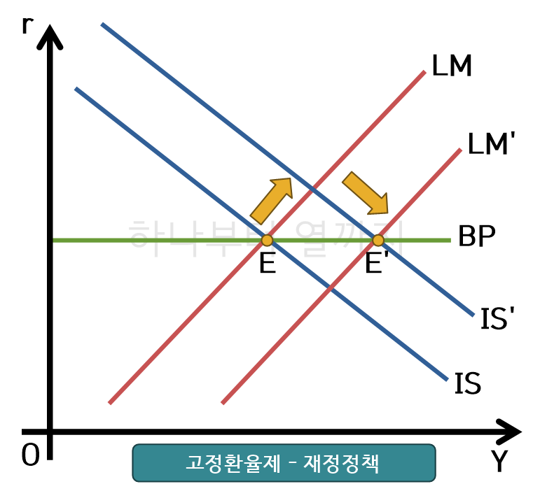 정부지출을 증가시키는 재정정책을 사용할 경우, IS곡선은 단기간에 우측으로 이동하게 됩니다. 그런데 IS가 상승하게 되면 단기적으로 국내 이자율(r)이 해외 이자율(r*)보다 높아지게 되므로 외화가 자국 내로 급격히 유입되어 환율 하락 압력을 받게 됩니다. 정부는 현재 환율 수준을 유지하기 위해 자국 통화량을 늘려야 하고 그 결과 LM이 우측 이동하게 되는데 그 수준은 r=r*가 되는 수준까지 통화량을 증가시키게 됩니다.