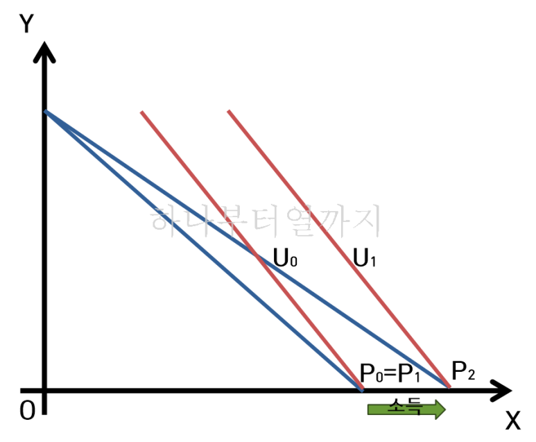 다만 상대가격 변화에 따른 실질소득의 증가 또는 감소가 생기기 때문에 이에 따른 소득효과만 존재합니다.