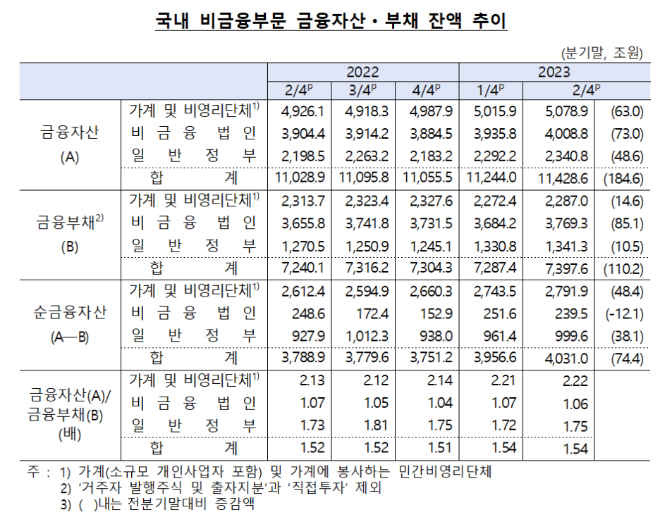 이 글의 대부분의 내용은 한국은행 경제통계시스템(ECOS) 및 2/4분기 자금순환 보도자료(23.10.6.)를 참고했음을 밝힙니다.