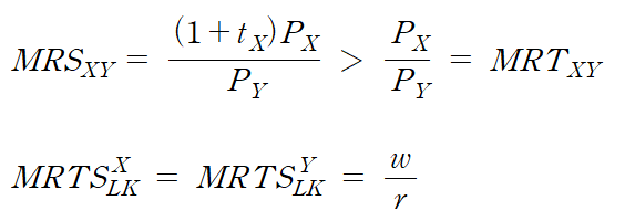 물품세가 부과되면 생산물시장에서 가격교란이 일어나 한계대체율(MRS)과 한계생산율(MRT)이 불일치하여 생산과 소비의 효율성이 파괴됩니다.