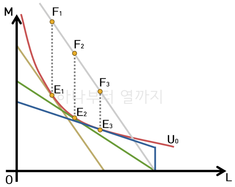 생각해보면, 최초 예산선 대비 여가의 기회비용의 변동에 따른 대체효과가 작을수록 조세에 따른 시장의 왜곡이 적으므로 정액세, 비례세, 누진세 순으로 효율적인 결과를 얻게 됩니다.