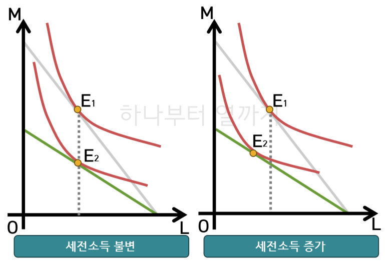 하지만, 소득효과가 더 커질 경우 노동공급이 오히려 늘어날 수 있으며 이 경우 세전소득은 늘어나게 됩니다.