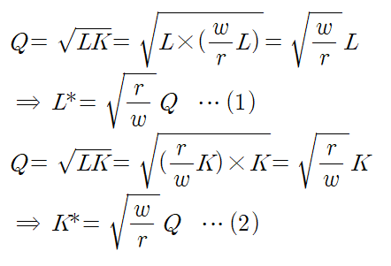 예시로 사용하는 생산함수에 대해서 조건부요소수요함수와 장기비용함수를 구하면 아래와 같습니다.
