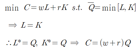 여기서 비용함수가 레온티에프 모양이라는 것은 아니고 비용함수는 선형이되, 그 계수가 minimum 함수에 의해 정해진다는 의미입니다.