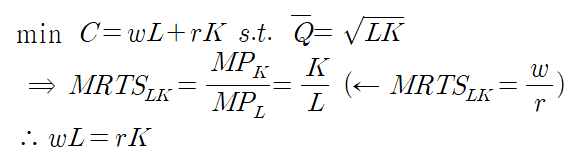 한계기술대체율의 값과 요소가격의 상대적비율이 동일한 1계 조건이 만족할 때 wL=rK가 성립하며 이를 다시 생산함수에 대입하면 조건부 요소수요함수를 아래와 같이 유도할 수 있습니다.