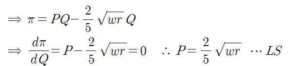 이제 해당하는 장기비용함수를 이윤식에 대입해서 이윤을 극대화하는 값을 구하면 됩니다.